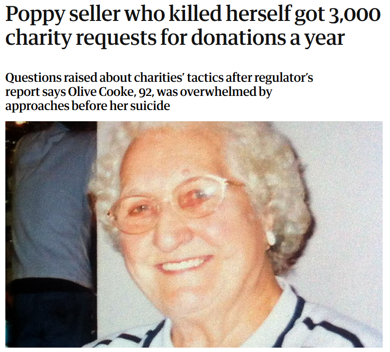 Sagen om Olive Cooke blev et vendepunkt i debatten om antallet af opkald, mails og breve i England og om etik i fundraising. Omtalen er fra The Guardian.
