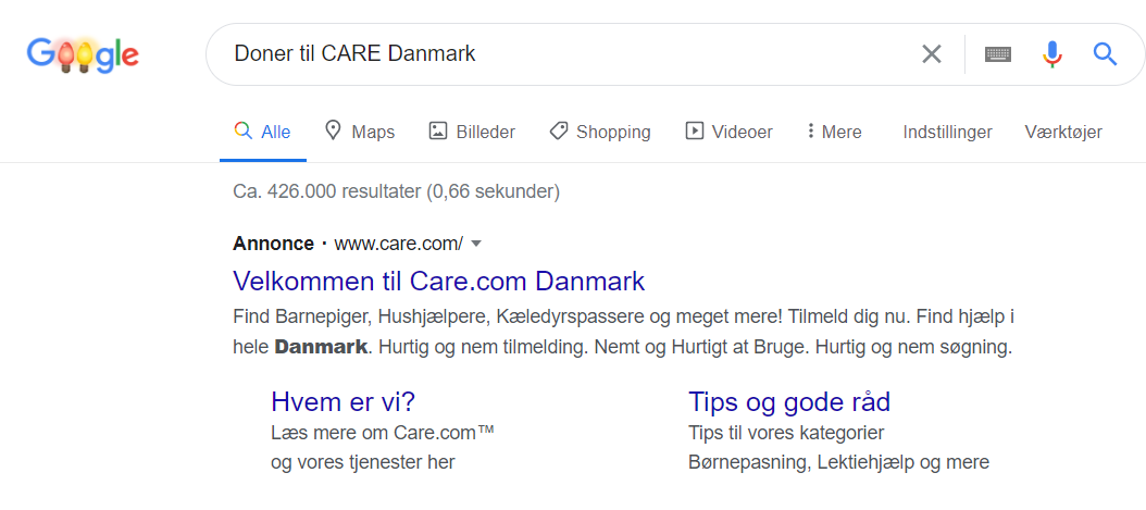 Har du googlet dig selv? En af de medlemsorganisationer, der ikke har styr på de mere basale marketingstrategier, er udviklings- og klimaorganisationen CARE Danmark. Googler man CARE Danmark for at give en donation, møder man i stedet annoncer for barnepiger, kæledyrspassere og meget mere. I 2021 bliver det kun endnu vigtigere, at NGO’er formår at tage ejerskab på eget brand.